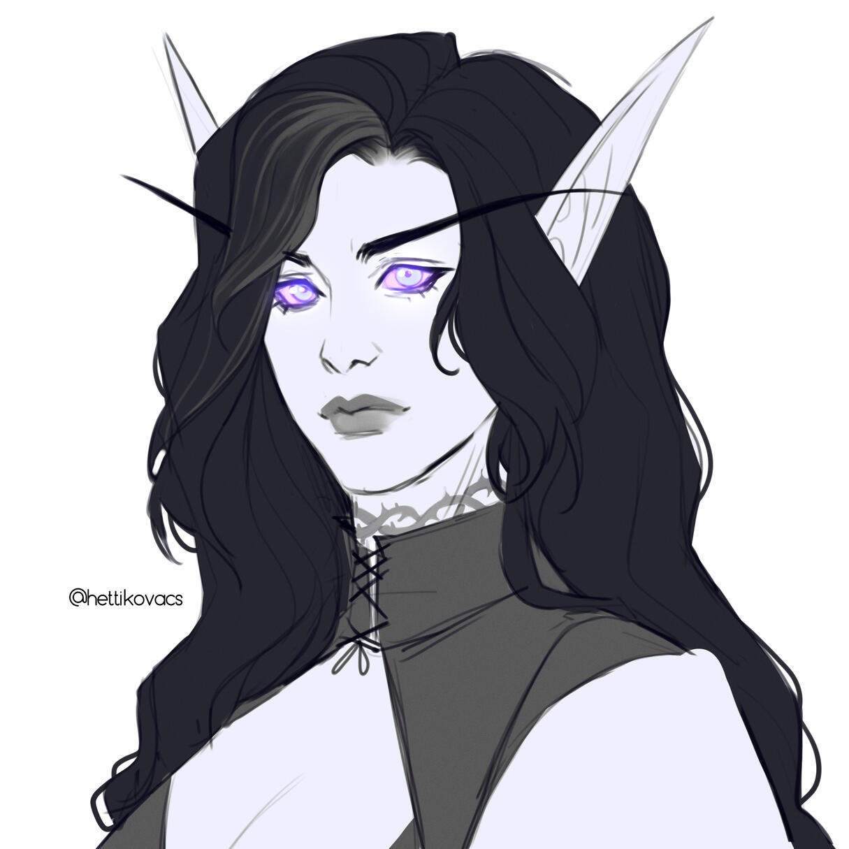 Appearance (post-Void): Pale, almost gray-ish skin, with high cheekbones, cat-like eyes, and a hollow smile. Long black hair with a single streak of white. Her eyes glow violet, a testament to the Void transformation. Her arms and legs stained black. Robes of layered silk and corseted gowns, with weapons sewn into every facet. A ruby locket around her neck.Appearance (pre-Void): Pale complexion, with silver eyes flecked with gray. Long pale-blonde hair often braided in intricate crowns, held in place by combs made of silver. She wore corseted gowns in deep blacks and purples.Xal'irra embodies both the cruelty and genius of her lineage. A brilliant field medic and heiress to the House, she took her father's precision and subtle cruelty and her mother's ambition to new depths. Her loyalty to House Spiderfang is absolute. Formerly betrothed to Charnel Noctbriar, her rival and only former lover. Their split reignited tensions between the Houses.Currently: Acting as an informant for Vaeun Highmourne, acting medic for the Thalassian Accord.