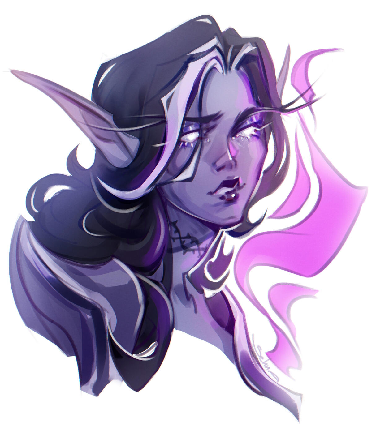 Appearance (post-Void): Pale, almost gray-ish skin, with high cheekbones, cat-like eyes, and a hollow smile. Long black hair with a single streak of white. Her eyes glow violet, a testament to the Void transformation. Her arms and legs stained black. Robes of layered silk and corseted gowns, with weapons sewn into every facet. A ruby locket around her neck.Appearance (pre-Void): Pale complexion, with silver eyes flecked with gray. Long pale-blonde hair often braided in intricate crowns, held in place by combs made of silver. She wore corseted gowns in deep blacks and purples.Xal'irra embodies both the cruelty and genius of her lineage. A brilliant field medic and heiress to the House, she took her father's precision and subtle cruelty and her mother's ambition to new depths. Her loyalty to House Spiderfang is absolute. Formerly betrothed to Charnel Noctbriar, her rival and only former lover. Their split reignited tensions between the Houses.Currently: Acting as an informant for Vaeun Highmourne, acting medic for the Thalassian Accord.