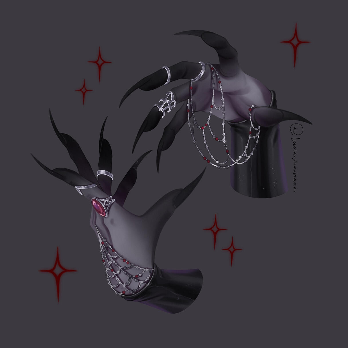 But she was no longer in the shadows of the noble courts. Having willingly entered the void alongside Umbric and the rest of his cronies in a bid to escape pursuit, but also as a form of self-imposed exile. She emerged changed--her pale-blonde hair turned the color of ink, her silver eyes swallowed by glowing violet. A twisted echo of what she had been.And around her throat, wrapped about it like a noose, lied a tattooed crown of briars. A symbol she created. She seeded the rumor, herself: that all vassals of House Noctbriar were branded thus to swear loyalty--bound by blood. Her own agents, spread throughout each vassal house and even the Noctbriar house, wearing one.Every assassin, every rival, and every child of the vassal houses believed the mark meant something. Charnel couldn't dispute it, what with individuals having said markings. His lack of knowledge on the subject lead to doubt--even among his most loyal. Whispers bloomed like rot: Had Charnel lost control? Why did he not know of the customs of his own House? It meant nothing, truly, at least, not officially. Xal'irra had designed it to mean everything. Loyalty, Submission, Inheritance, Rebellion. Whatever the wearer needed it to mean. Some claimed it was a pact made in blood, others said it was a punishment for failure. But in truth it was power.Through that mark, she created a shadowed hierarchy out of Charnel's reach, but within his sphere of influence. She made the concept of control feel like an illusion. And for a man like Charnel, whose entire rule balanced on absolute mastery, it was the deepest cut she could give.And all the while, she watches.Not from a high court or shadowed spire, but from the outer edges of Thalassian power--untethered, but not without influence.For Xal'irra knew, that Charnel had a hand in her younger sister's disappearance. In the dismissive way her spoke of her, in that cruel edge in his eyes and that innocent facade. She knew that somehow, or for whatever reason, Thalryss had delivered Aelrya to Charnel. There was no body, no note, nothing. A trail of inconsistences. And when Charnel began sending those enforcers, not for the betrayal, but to silence her. She took it as proof.